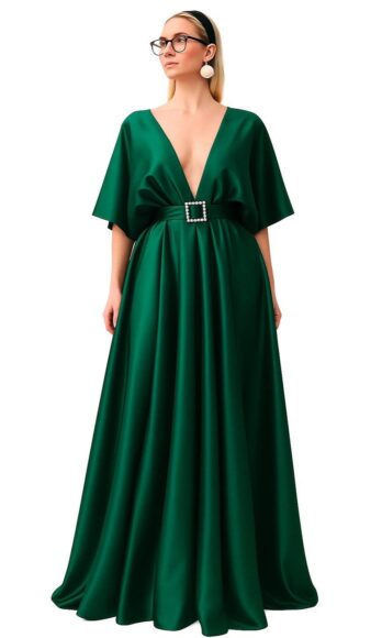Blush loose-sleeve pocket-skirt removable-belt green satin party dress