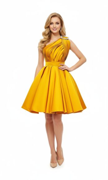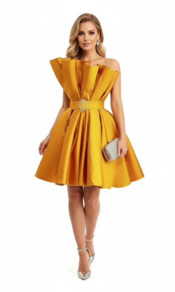 Blush ruffle-pleated top ball-skirt yellow satin party dress