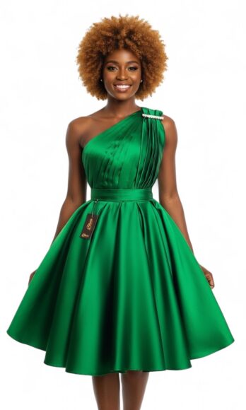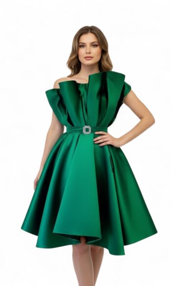 Blush one shoulder diamond-buckle pocket-skirt green satin dress