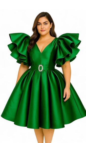 Blush ruffle maxi-sleeve diamond-buckle pocket-skirt green satin dress