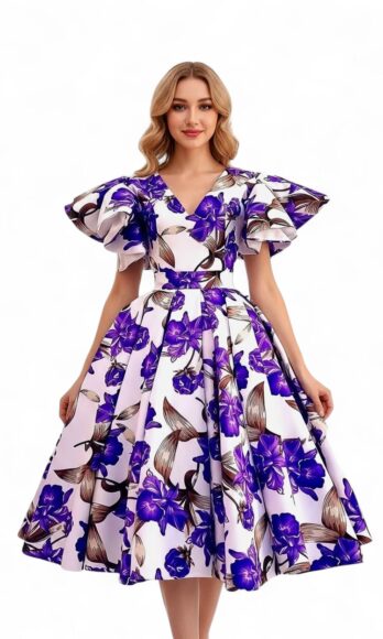 Blush african-print ruffle-sleeves maxi-skirt front-slit cotton party dress