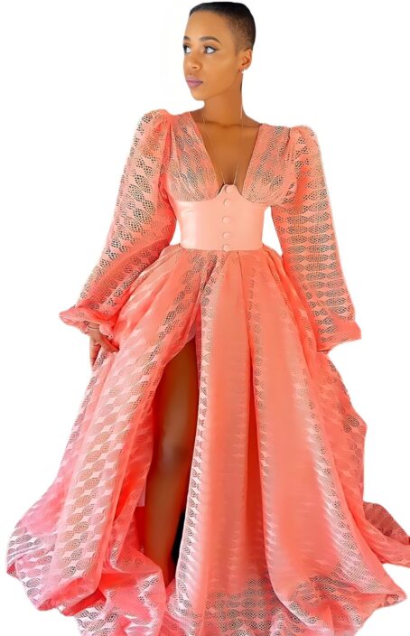 “Blush the dress” is a maxi designed in salmon. This dress features a waist corset with lined buttons and a string that ties from the corset to the neck. Blush has long puff sleeves and a front cleavage. “Blush the dress” is entirely crafted in lace, with a ball skirt with pockets and front slit.