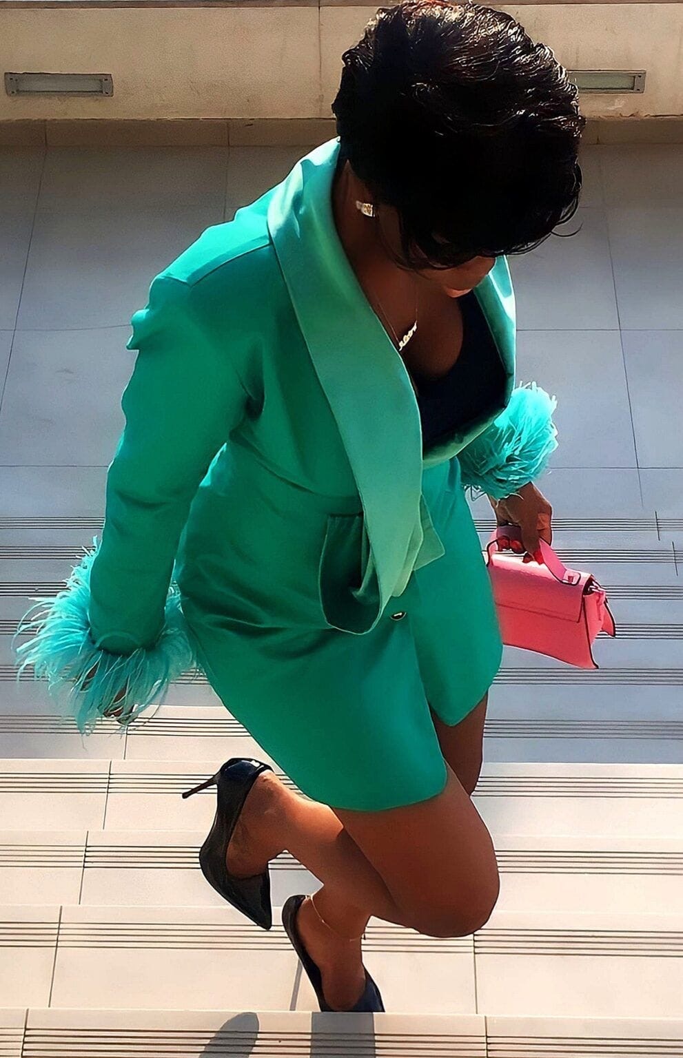 “Brandy” is a versatile look designed in green. With long sleeves, a V-neck cut and a front diamond/neutral button fastening, brandy has two unique details: a feather trim on the wrists and a satin neck flounce. This slim fit blazer dress features two side flap pockets.