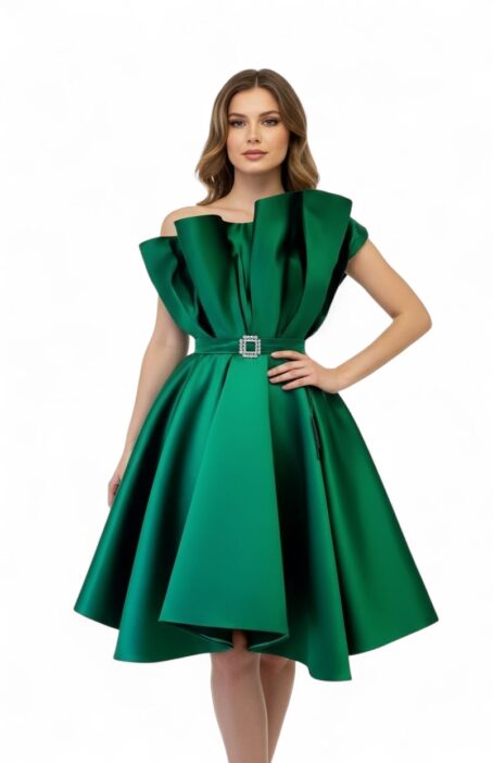 Designed in emerald green Olivette has the body covered with pleated ruffles on the front and a lovely asymmetric ball skirt. This dress includes a removable belt with a buckle crafted with shiny stones. All dress is made up with nobel satin material, details that makes Olivette an elegant and stunning dress.